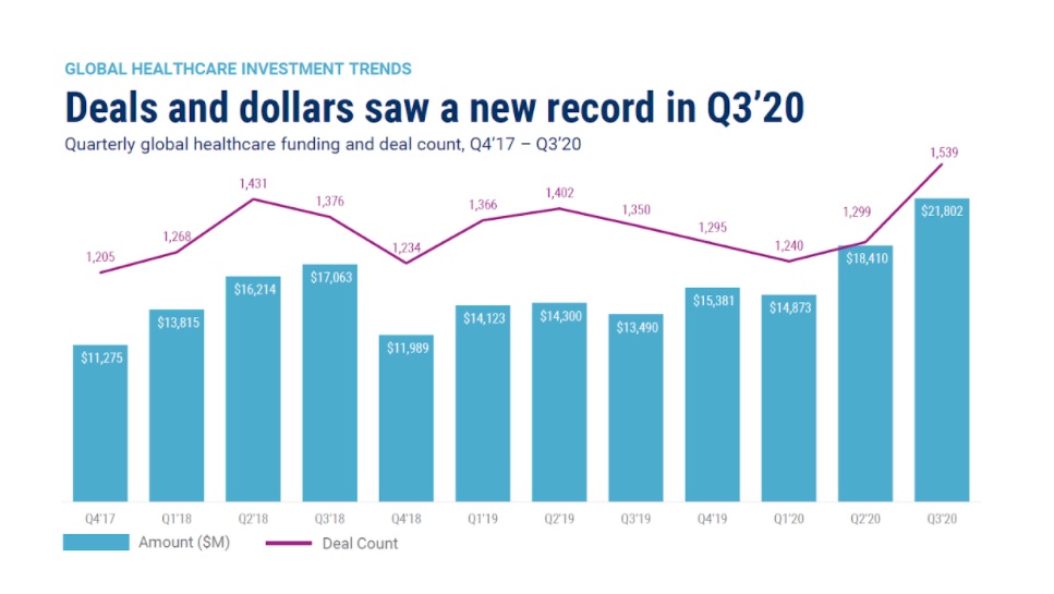 - Global healthcare funding has demonstrated growth in 2020, Q3 has set a new record in both deals and dollars.