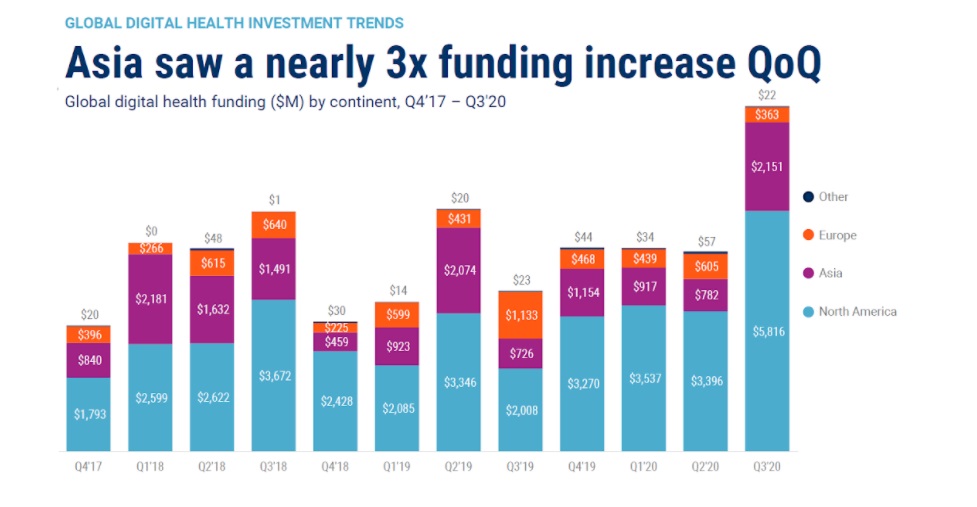 - North America, Asia, Europe showed an uptick quarter-over-quarter. Asia-based digital healthcare showed a triple funding increase.