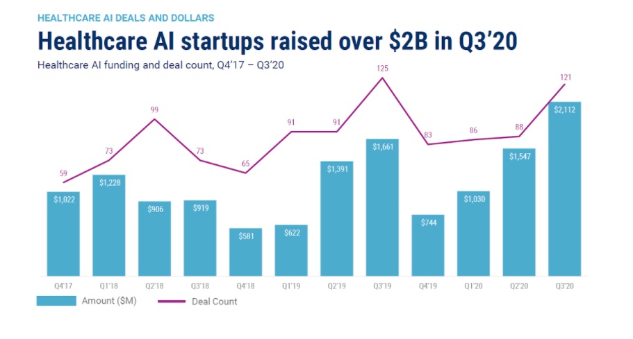 - Investments into telehealth were up to $2.8B in Q3, which is 73% more than in Q2. Such a result was reached because of the top 5 deals, which took around $900M of total quarterly funding.